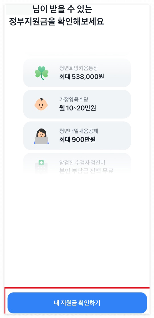6. [결과보기] 선택 후 해당되는 지원금 리스트 및 금액을 확인합니다.토스에서 숨은 정부지원금 찾기