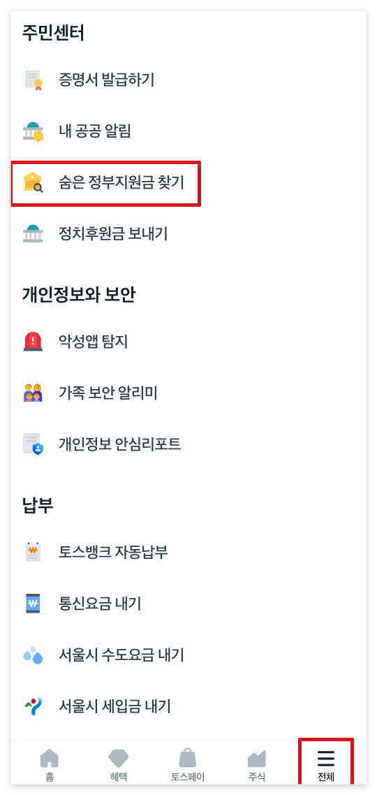 2. 토스 메인화면의 오른쪽 하단 [전체메뉴]를 선택합니다.3. 세부 메뉴 하단으로 내려 [주민센터] 카테고리 에서 [숨은 정부지원금 찾기]를 클릭합니다.